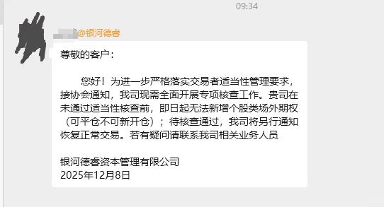 近日,一張關(guān)于銀河德睿資本管理有限公司(下稱“銀河德睿”)發(fā)送給客戶的通知在業(yè)內(nèi)廣泛流傳。該通知顯示,這家期貨風(fēng)險(xiǎn)管理子公司為落實(shí)交易者適當(dāng)性管理要求,需開展專項(xiàng)核查,期間將暫停新增個(gè)股類場(chǎng)外期權(quán)業(yè)務(wù),但平倉(cāng)業(yè)務(wù)可繼續(xù)進(jìn)行。