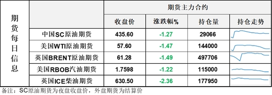 【1】WTI主力原油期貨收跌0.86美元,跌幅1.47%,報(bào)57.6美元/桶;布倫特主力原油期貨收跌0.93美元,跌幅1.49%,報(bào)61.28美元/桶;INE原油期貨收跌1.27%,報(bào)435.6元。