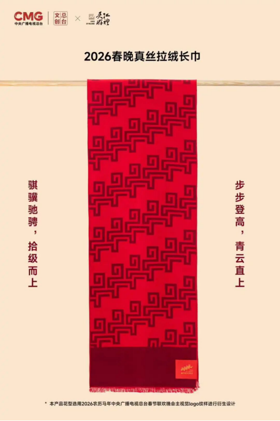 12月10日,中央廣播電視總臺(tái)《2026年春節(jié)聯(lián)歡晚會(huì)》發(fā)布主題和主標(biāo)識(shí),其主標(biāo)識(shí)為“騏驥馳騁紋”,同款紋樣的紅圍巾同步亮相。這抹承載著團(tuán)圓期盼的“吳江紅”,已是總臺(tái)文創(chuàng)與“吳江游禮”的第三年聯(lián)名之作。