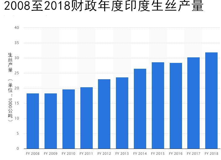 這一統(tǒng)計數(shù)據(jù)顯示了2008至2018年印度生絲生產總量。2018年財政年度,印度生絲產量約為3.2萬公噸,比上一個財政年度有所增加。