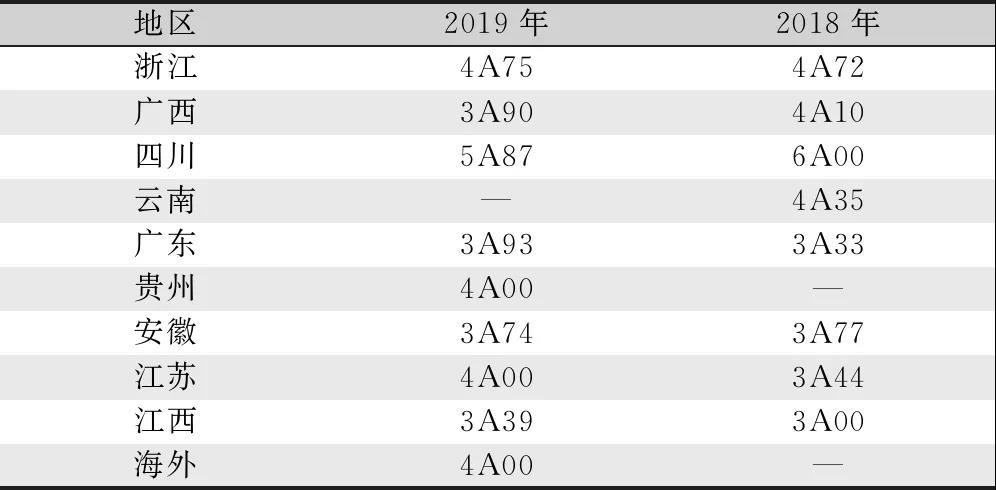 表6 2018年與2019年生絲不同地區(qū)平均等級