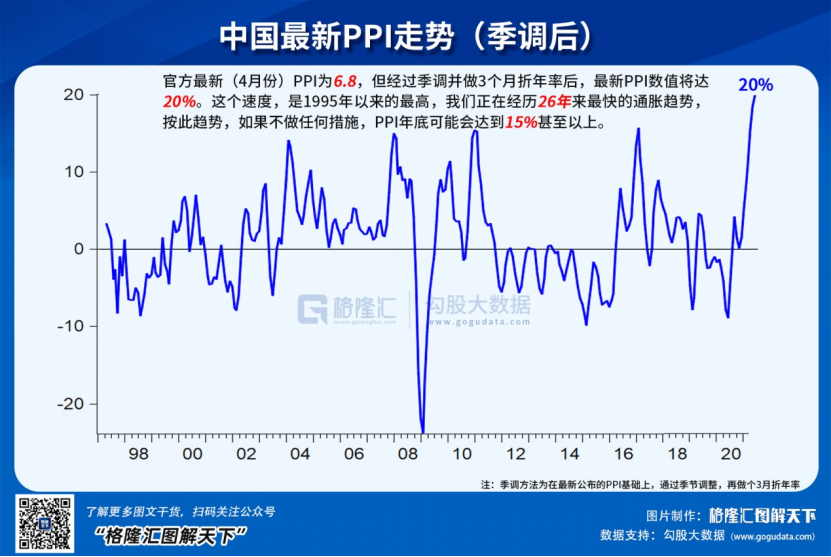 這個(gè)速度,是1995年以來(lái)的最高,我們正在經(jīng)歷26年以來(lái)最快的通脹。很明顯,今年1-5月的上漲速度極其驚人。我們的歷史上還從來(lái)沒(méi)有一個(gè)高通脹年份有過(guò)這么快的PPI上漲。
