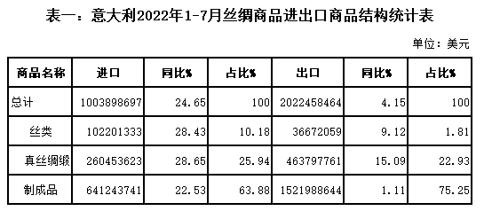 表一:意大利2022年1-7月絲綢商品進(jìn)出口商品結(jié)構(gòu)統(tǒng)計(jì)表