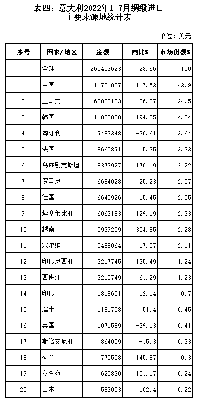 表四:意大利2022年1-7月綢緞進(jìn)口主要來源地統(tǒng)計(jì)表