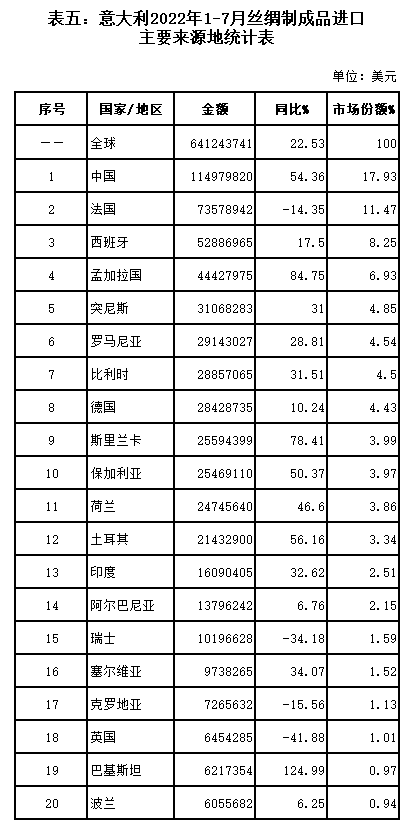 表五:意大利2022年1-7月絲綢制成品進(jìn)口主要來源地統(tǒng)計(jì)表