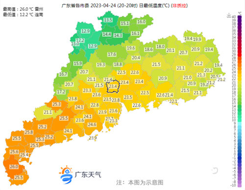 25日,珠江三角洲、粵西和粵北市縣多云到陰天,有中(雷)雨,局部大雨或暴雨,其余市縣有(雷)陣雨,局部大雨。早晨最低氣溫:清遠(yuǎn)和韶關(guān)北部12℃~15℃,南部沿海市縣21℃~25℃,其余市縣16℃~20℃。