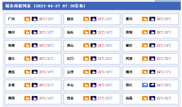 27日,粵西、珠江三角洲西部市縣、清遠和韶關多云到陰天,有分散(雷)陣雨,其余市縣多云為主,局部有(雷)陣雨,中西部市縣早晚有(輕)霧。早晨最低氣溫:粵北偏北市縣11℃~14℃,南部沿海和珠江三角洲中南部市縣17℃~22℃,其余市縣14℃~17℃。