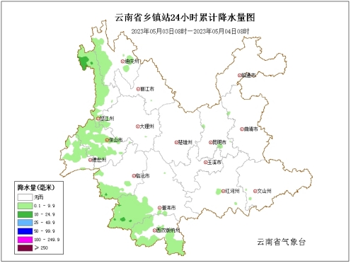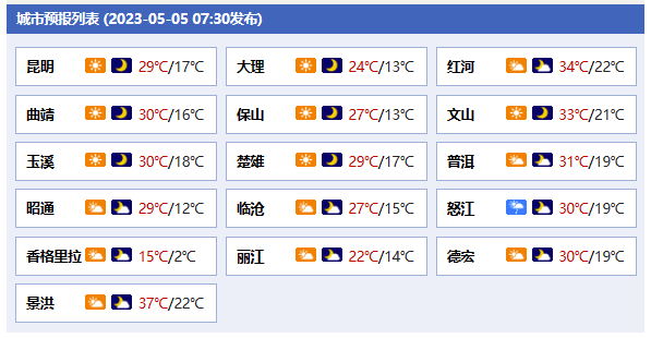 05月05日20時到05月06日20時:昭通東部、曲靖東部、文山東部多云間陰有雷陣雨局部中雨,迪慶西部、怒江、保山北部多云有陣雨,其它地區(qū)多云間晴。