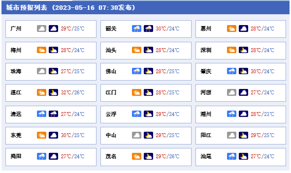 16日,韶關(guān)、清遠(yuǎn)多云到陰天有(雷)陣雨,珠江三角洲中南部和粵東沿海多云間陰,有分散(雷)陣雨,其余市縣多云間陰天。最高氣溫:粵西、珠三角西部市縣28℃~31℃,其余市縣25℃~28℃。