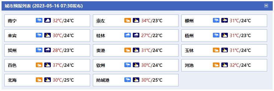 南寧市:今天白天陰天有小雨,今天晚上陰天,偏南風1~2級,最高氣溫32℃,最低氣溫24℃。