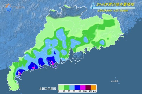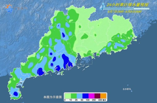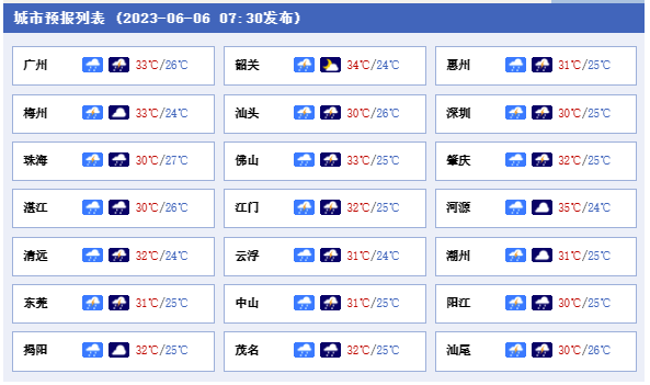 6日-7日,粵西和珠江三角洲市縣有中到強(qiáng)雷雨局部暴雨或大暴雨,其余市縣有雷陣雨局部大雨或暴雨。最高氣溫:粵西和沿海市縣30℃~32℃,其余大部分市縣33℃~35℃。