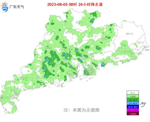 天氣實(shí)況:4日白天至5日早晨,廣東繼續(xù)維持較炎熱天氣,全省大部分市縣出現(xiàn)了雷陣雨、局部暴雨,雷雨時(shí)部分市縣出現(xiàn)了7級~8級左右短時(shí)大風(fēng)。據(jù)監(jiān)測,有11個(gè)鎮(zhèn)街錄得超過50毫米的暴雨,有114個(gè)鎮(zhèn)街錄得25毫米~50毫米的大雨,各市雨量最大的鎮(zhèn)街有:廣州增城區(qū)新塘鎮(zhèn)73.4毫米、東莞厚街鎮(zhèn)72.5毫米、湛江雷州市沈塘鎮(zhèn)69.5毫米等。