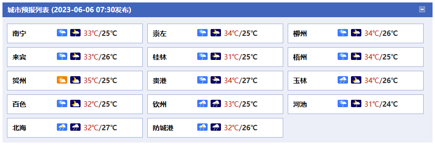 今天白天,百色、河池、柳州三市南部、南寧、崇左兩市北部及防城港、玉林等市的部分地區(qū)有中雨、局地大雨到暴雨,并伴有短時雷暴大風(fēng)等強(qiáng)對流天氣,我區(qū)其它地區(qū)多云有陣雨或雷雨、局地大雨。最高氣溫:全區(qū)30~34℃。今天晚上,玉林、北海、欽州、防城港等市的部分地區(qū)有中雨、局地大雨,我區(qū)其它地區(qū)多云大部有陣雨或雷雨。