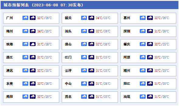 明后天,廣東大部分市縣有中雷雨,局部暴雨或大暴雨。最高氣溫:沿海市縣31℃~33℃,其余市縣普遍介于33℃~35℃。