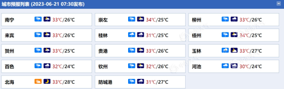 南寧市:今天白天到晚上,多云有陣雨或雷雨,偏南風(fēng)2~3級,最高氣溫33℃,最低氣溫26℃。
