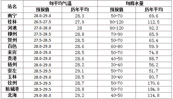 全區(qū)旬平均氣溫、旬降雨量預報如下: