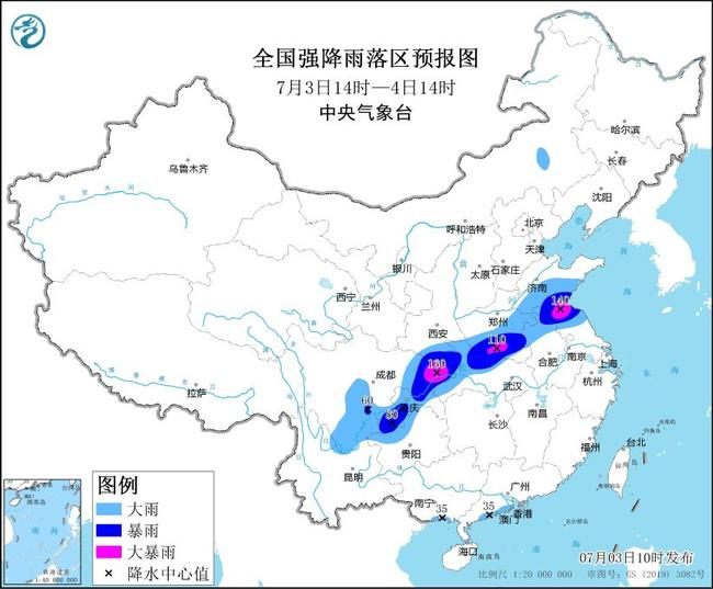 預(yù)計(jì),7月3日14時(shí)至4日14時(shí),四川東北部和南部、云南東北部、重慶大部、貴州西北部、湖北西部、河南中南部、山東中南部、安徽北部、江蘇北部等地部分地區(qū)有大到暴雨,其中,河南西南部、山東南部、江蘇北部、四川東北部、重慶北部等地局地有大暴雨(100~160毫米)。上述部分地區(qū)伴有短時(shí)強(qiáng)降水(最大小時(shí)降雨量20~50毫米,局地可超過(guò)60毫米),局地有雷暴大風(fēng)等強(qiáng)對(duì)流天氣。