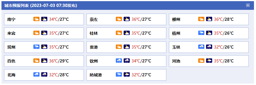 南寧市:今天白天到今天晚上,多云、局地有陣雨或雷雨,偏南風(fēng)2級,最高氣溫34℃,最低氣溫27℃。