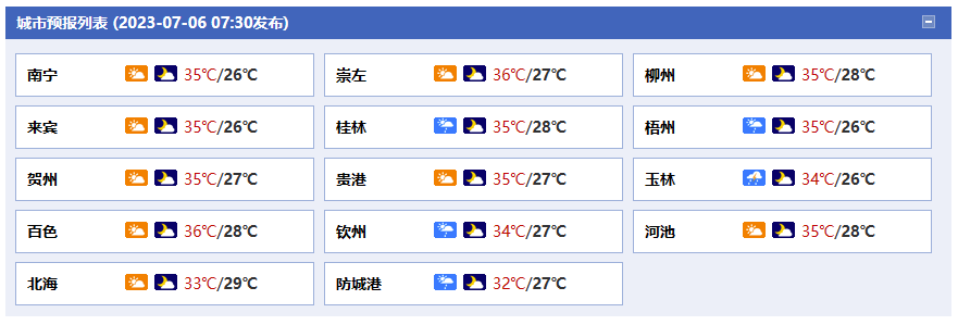 南寧市:今天白天到晚上,多云、局地有陣雨或雷雨,偏南風(fēng)2~3級,最高氣溫35℃,最低氣溫26℃。