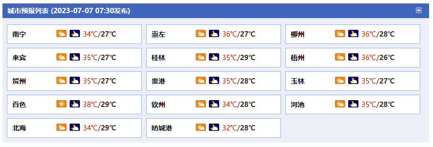 南寧市:今天白天多云、局地有陣雨或雷雨,今天晚上多云,偏南風(fēng)2~3級(jí),最高氣溫34℃,最低氣溫27℃。