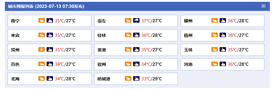 今天白天,全區(qū)多云到晴有分散陣雨或雷雨,其中百色、防城港、欽州、北海、玉林等市局地有大雨。最高氣溫:全區(qū)大部35~37℃、局地38℃以上。
