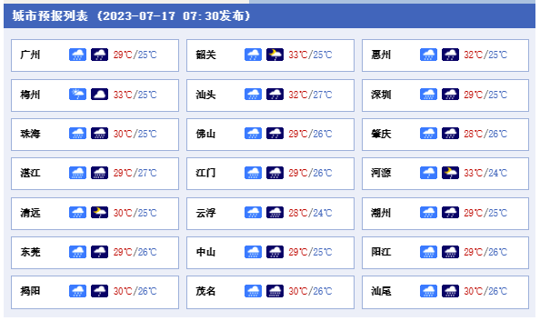 城市方面,廣州今天,陰天,有大雨局部暴雨;氣溫24℃~30℃;相對濕度在65~95%之間。