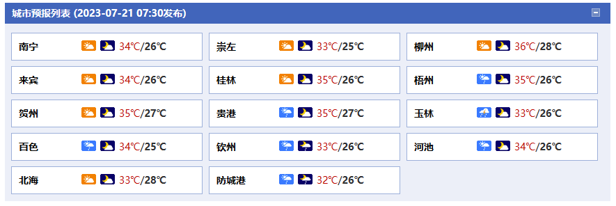 今天白天到晚上,全區(qū)多云大部有陣雨或雷雨、局地大雨到暴雨。桂東、桂北部分地區(qū)最高氣溫33~35℃。