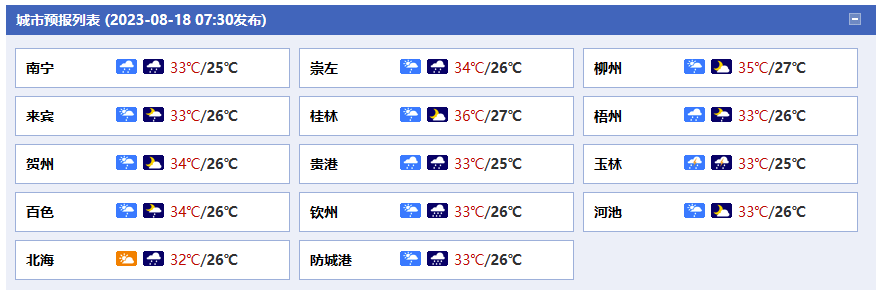 南寧市:今天白天到晚上,中雨、局地大雨或暴雨,偏東風(fēng)1~2級,最高氣溫33℃,最低氣溫25℃。